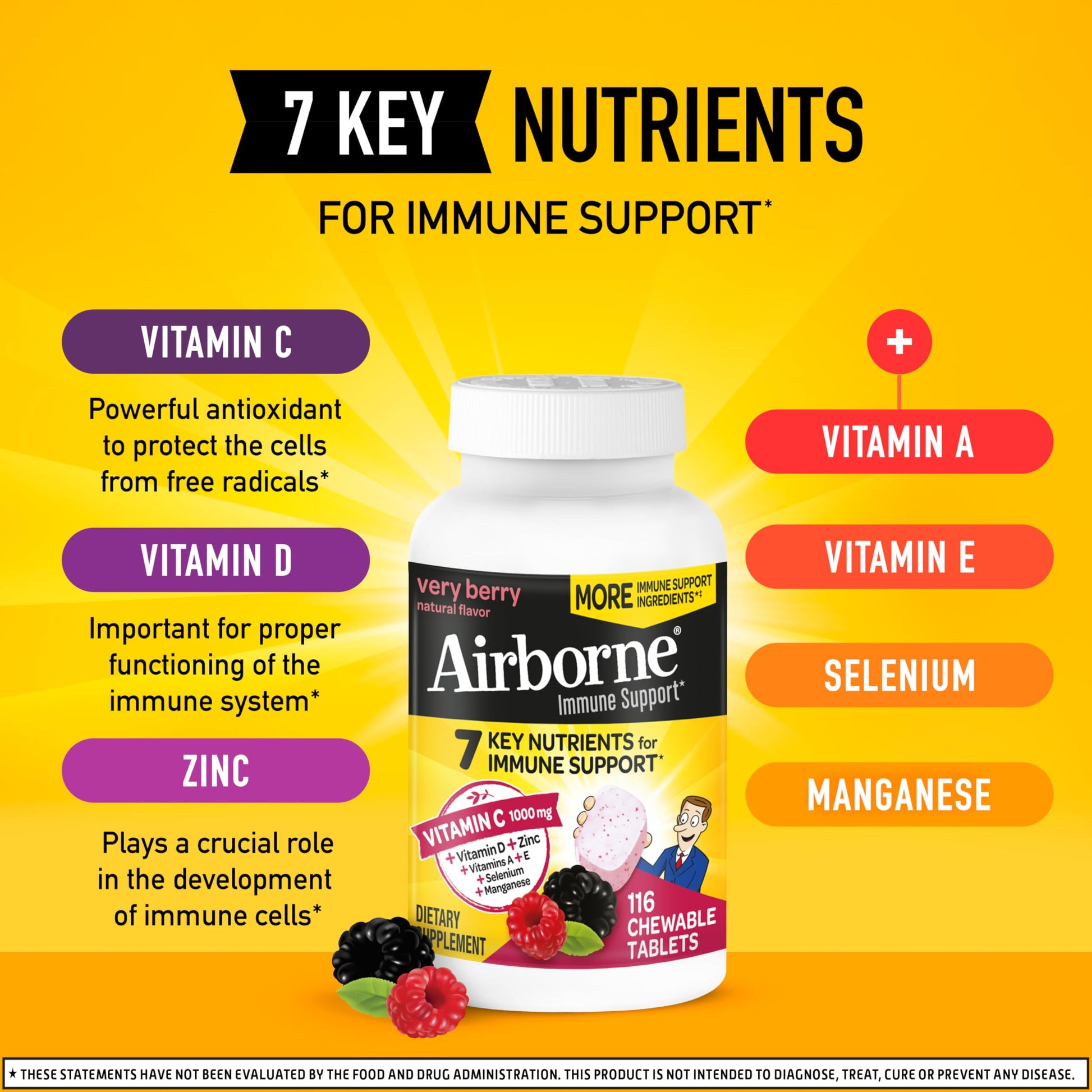 Details: "VITAMIN C 1000mg: Airborne immune support chewable tablets are packed with 1000mg Vitamin C per serving, which helps support your immune system. ZINC SUPPLEMENT: These Vitamin C with Zinc chewable tablets NOW contain 100 percent of your daily value of Zinc, which plays a central role in your immune system and is essential for the functioning and signaling of immune cells. VITAMIN D SUPPLEMENTS: These tablets NOW contain 15000IU of Vitamin D3, important for proper functioning of the immune system*. POWERFUL ANTIOXIDANTS: Airborne immune support tablets contains the antioxidants Vitamin A to support immune health, Vit C to support immune health, Vitamin E to help fight free radicals, and Zinc to help maintain healthy immune cells. COMPLETE FORMULA: This crafted blend of 7 immune support vitamins is our most complete immune support formula yet.* It comes with minerals & herbs and it is an excellent source of Zinc and Selenium. NUMBER ONE IMMUNE SUPPORT EFFERVESCENT BRAND: Airborne is the Number 1 Immune Support Gummy, Effervescent & Chewable Brand (Based on unit sales L52W through 7/24/2024). GLUTEN FREE: Airborne Immune Support Chewable Tablets are Gluten Free, None-GMO, Caffeine Free, and manufactured in the USA with ingredients sourced globally. TASTY & TRAVEL-FRIENDLY: Add these tasty very-berry-flavored chewable tablets to your travel essentials. These Vitamin C tablets are convenient and easy for adults and for kids 14plus to take at home or on the go. *These statements have not been evaluated by the Food and Drug Administration. This product is not intended to diagnose, treat, cure or prevent any disease."