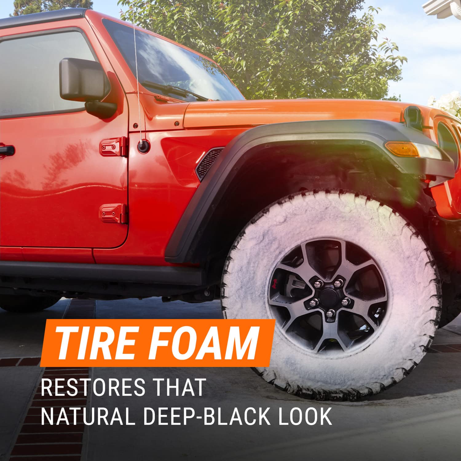 - TIRES: Tire shine and cleaner delivers intense foaming action to lift away ground-in dirt and leave behind nourishing conditioners that restore your deep black tire color