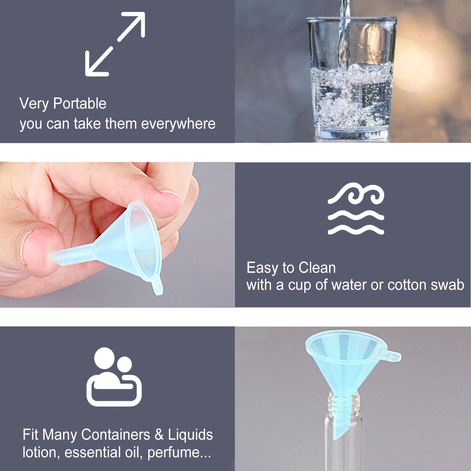 - No Leak - When filling with a refillable cosmetic bottle, a funnel would let all the essential product completely pour in your container, no leak and save your money. These funnels’ opening is merely 0.19in / 0.5cm, suitable for small bottles and not too thick liquid.