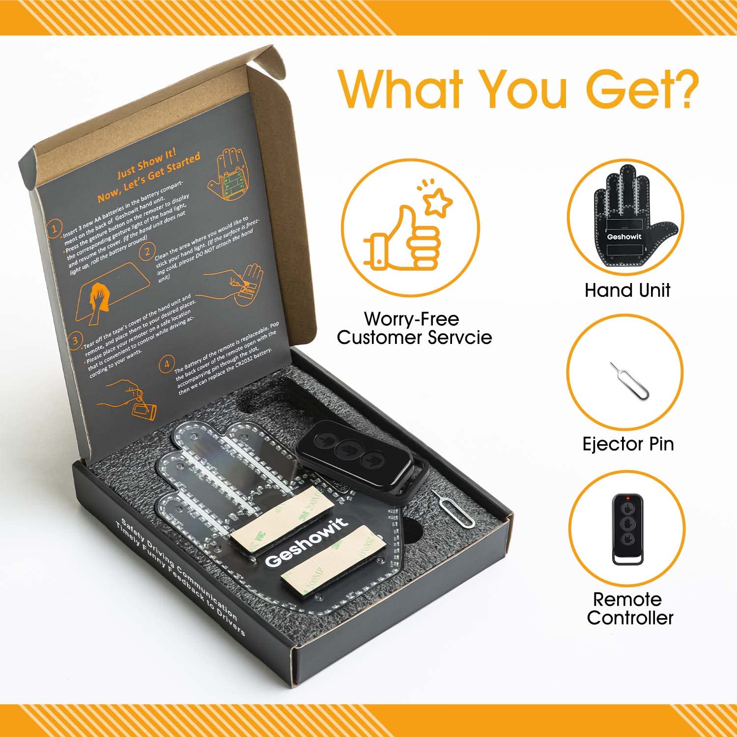 - 【What You Get】: 1x Geshowit Hand Unit (batteries not included) with attached 3M Velcro Adhesive Strips, 1x Remote Controller (batteries included) with attached 3M Velcro Adhesive Strips, 1x Ejector Pin, 1x User Manual. We highly care about the satisfaction of customers. Please don't hesitate to contact us if you have any questions.