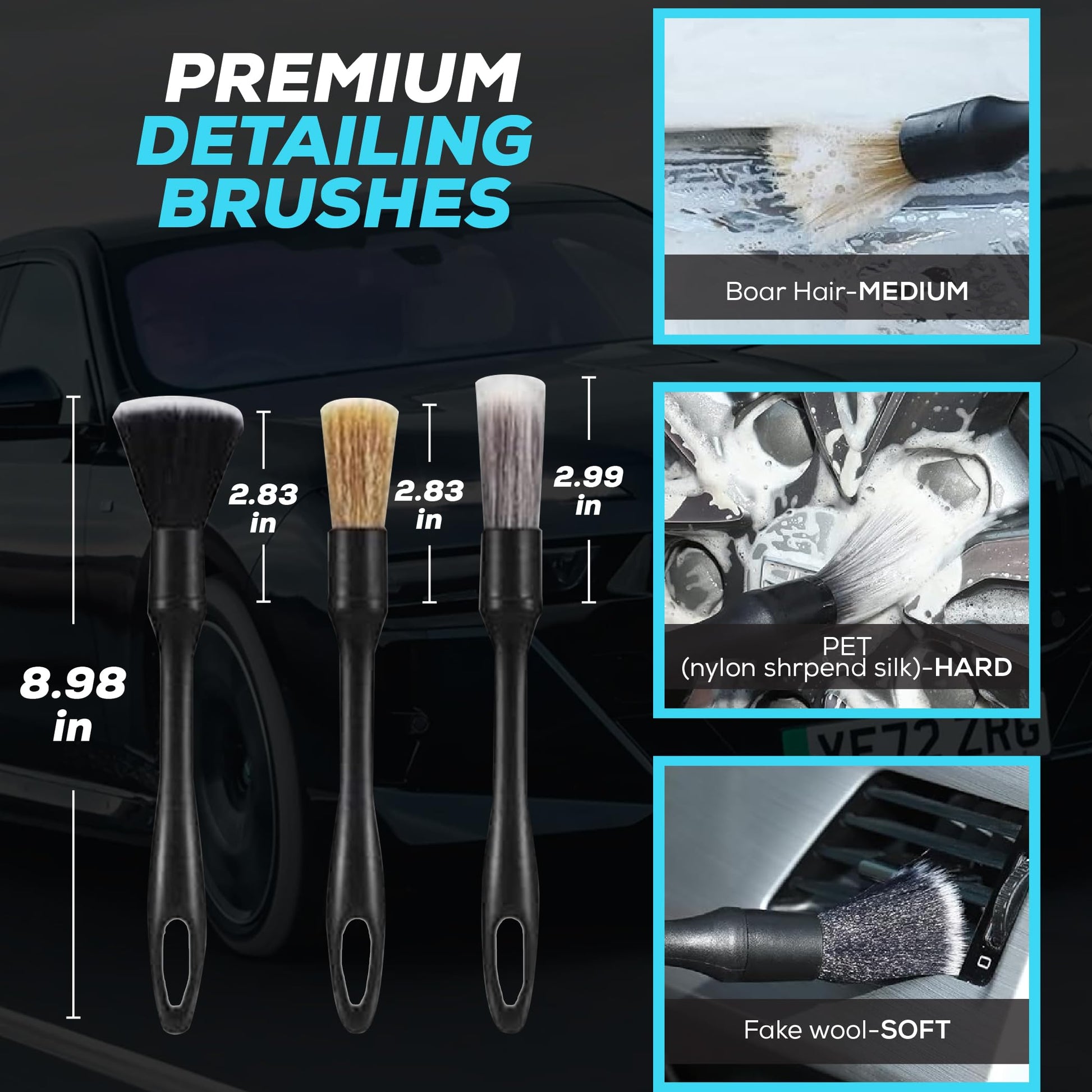 - 🚗 CAR DETAILING KIT INCLUDES ACCESSORIES: 1 Storage Bag, 1 Hand Pressure Pump Sprayer (2 additional nozzles), 3 Pro Car Detailing Brushes, 1 Absorbent Car Towel, 1 Tire Applicator, 1 Clay Bar for Car, 1 Car Window Squeegee, 1 Cleaning Gel for Car, 1 Microfiber Wash Mitt, 1 Air Vents Brush, 2 Microfiber Cleaning Cloths, 2 Soft Wax Applicator Sponges, 4 Car Seat Headrest Hooks, 1 Microfiber Applicator Pad, 3 Wire Brushes, 1 Wheel Brush.
