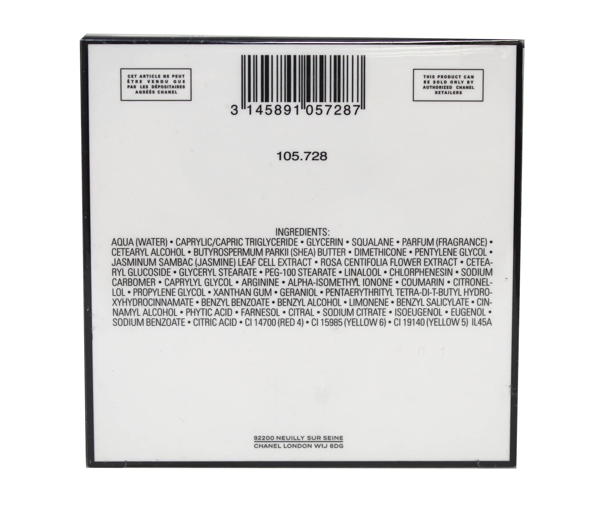 Details: Chanel Chanel N ° 5 crème Corps The body cream reveals the feminine and sensual chords of the notes that compose it. Its rich and creamy texture is applied generously on the body and leaves the skin soft and moisturized, delicately scented of N ° 5. Atmosphere olfactory Inspired satin harmony of rose and jasmine dialing # 5, the body cream has been formulated to revive with sensuality and sweetness of the # 5 floral bouquet. Inspiration In 1921, Gabrielle Chanel turns to Ernest Beaux to create "a woman's fragrance which smells of woman", original and intense. The perfumer proposes a visionary composition which provides a novel use of aldehydes. Mademoiselle prefers the version number 5 of the fragrance and, per its name, choose this simple number. The innovative fragrance, as well as the name and the disconcerting simplicity of the bottle, revolutionizing the history of perfumery. Art of fragrance A full ritual bath and body that allows you to sublimate the floral bouquet of N ° 5. The body cream is applied generously on the skin. An enveloping gestures and moisturizing.