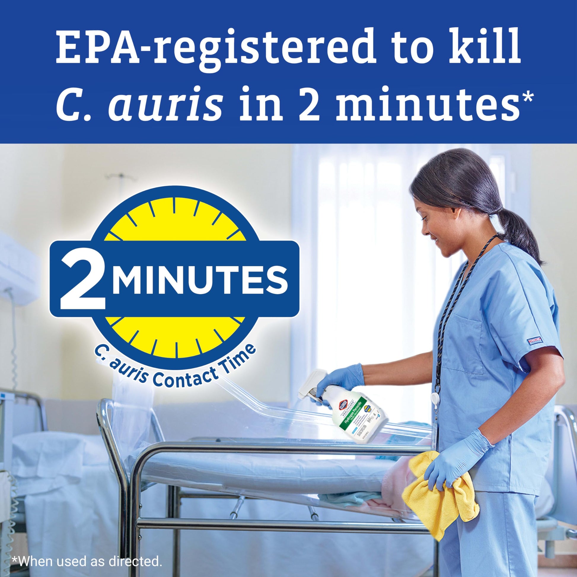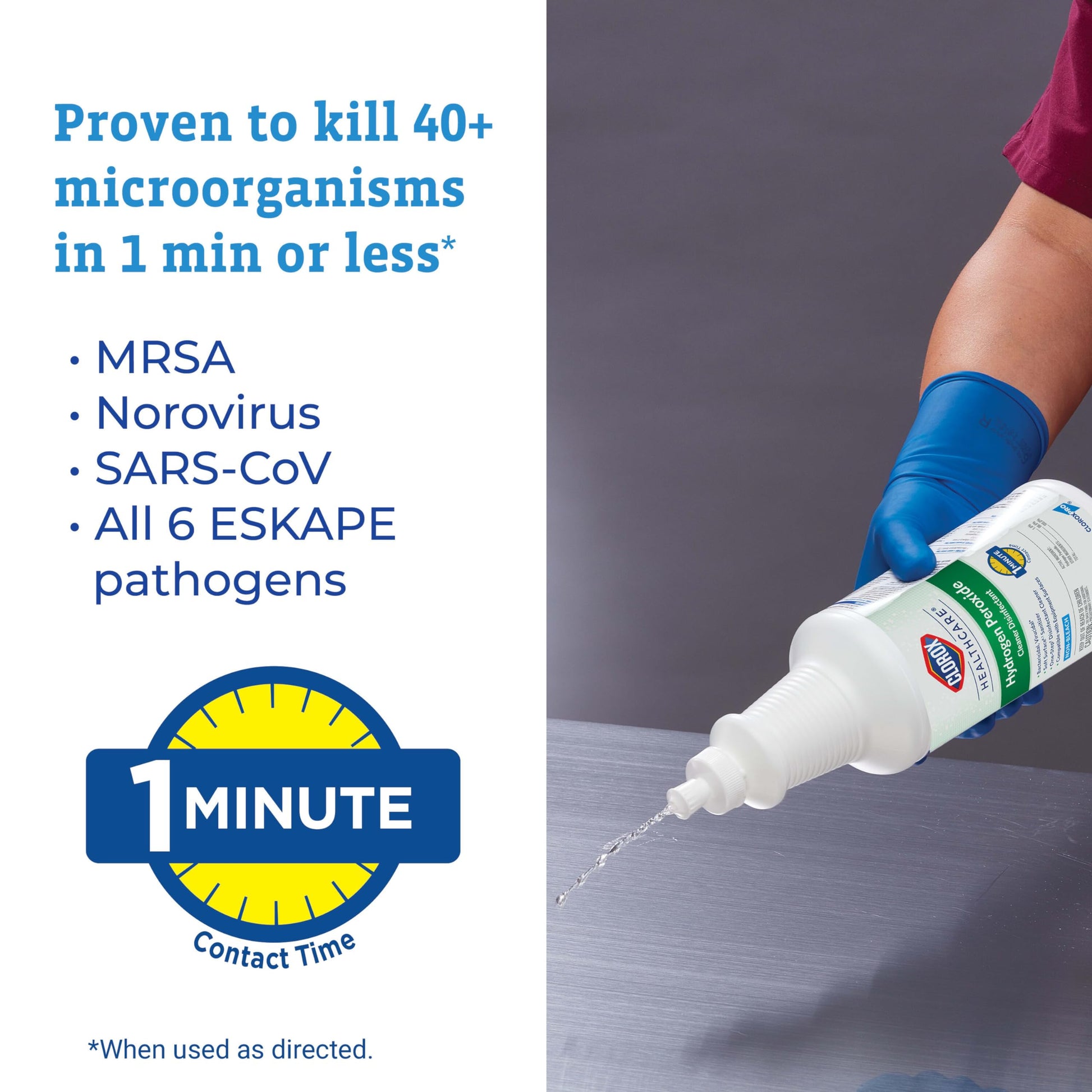 - DISINFECTANT SPRAY: Clorox Healthcare Hydrogen Peroxide Cleaner Disinfectant kills more than 40 bacteria and viruses in as little as 30 seconds