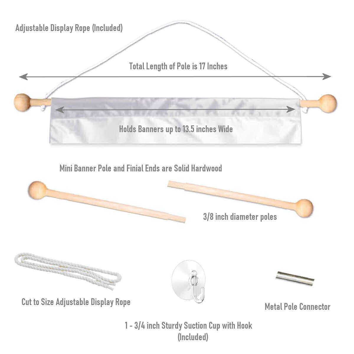 - Banner is 13x18 inches in size and includes 17 inch wide by 3/8 inch diameter Wood Banner Pole with cut to size display rope. Sturdy 1.75 inch diameter Suction Cup is included