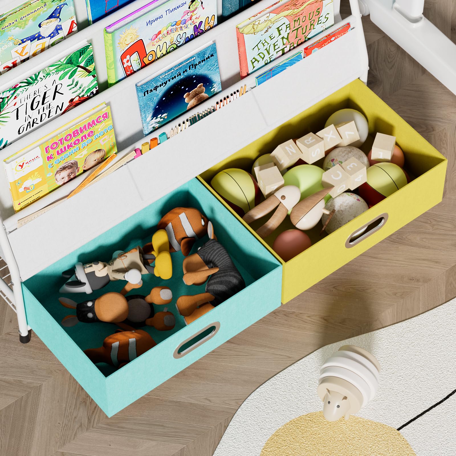 - [ High-Capacity ] 4-tier slings keep books well-organized and on display, 3 slots for storage stationery and art accessories. 2 Removable toy storage bins for organizating and easy clean up.