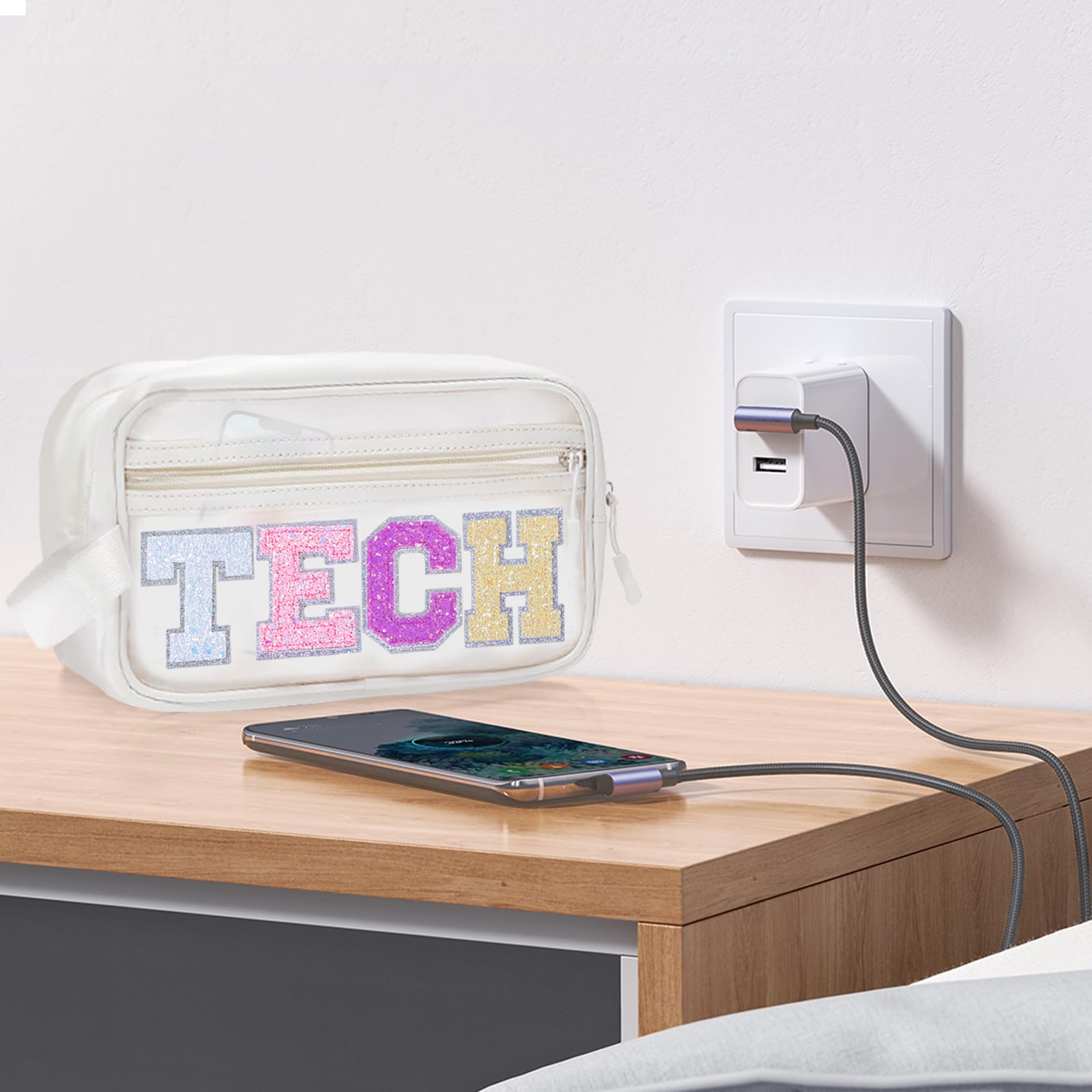 COSHAYSOO Clear Electronic Accessories Storage Bag Preppy Letter Patch Travel Pouch for Women Teens Girls, Cable Cord Charger Phone Earphone Organizer Trendy Traveling Must Have Essentials (TECH)