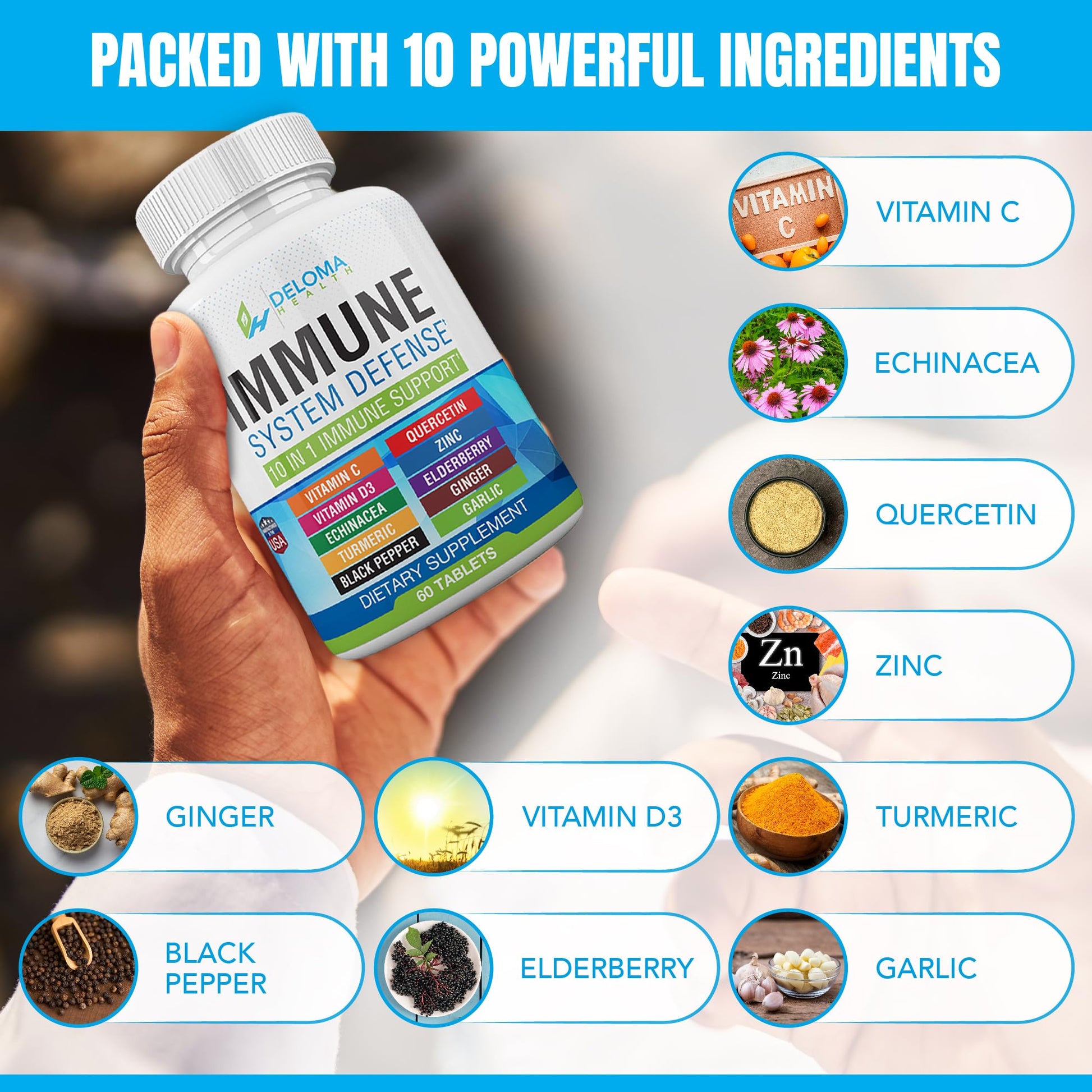 Deloma Health 10 in 1 Immune System Support Supplement - Vitamin C (1000 mg), Quercetin, Vitamin D3 (5000iu), Zinc (40 mg), Elderberry, Echinacea, Turmeric, Ginger, Garlic, Black Pepper