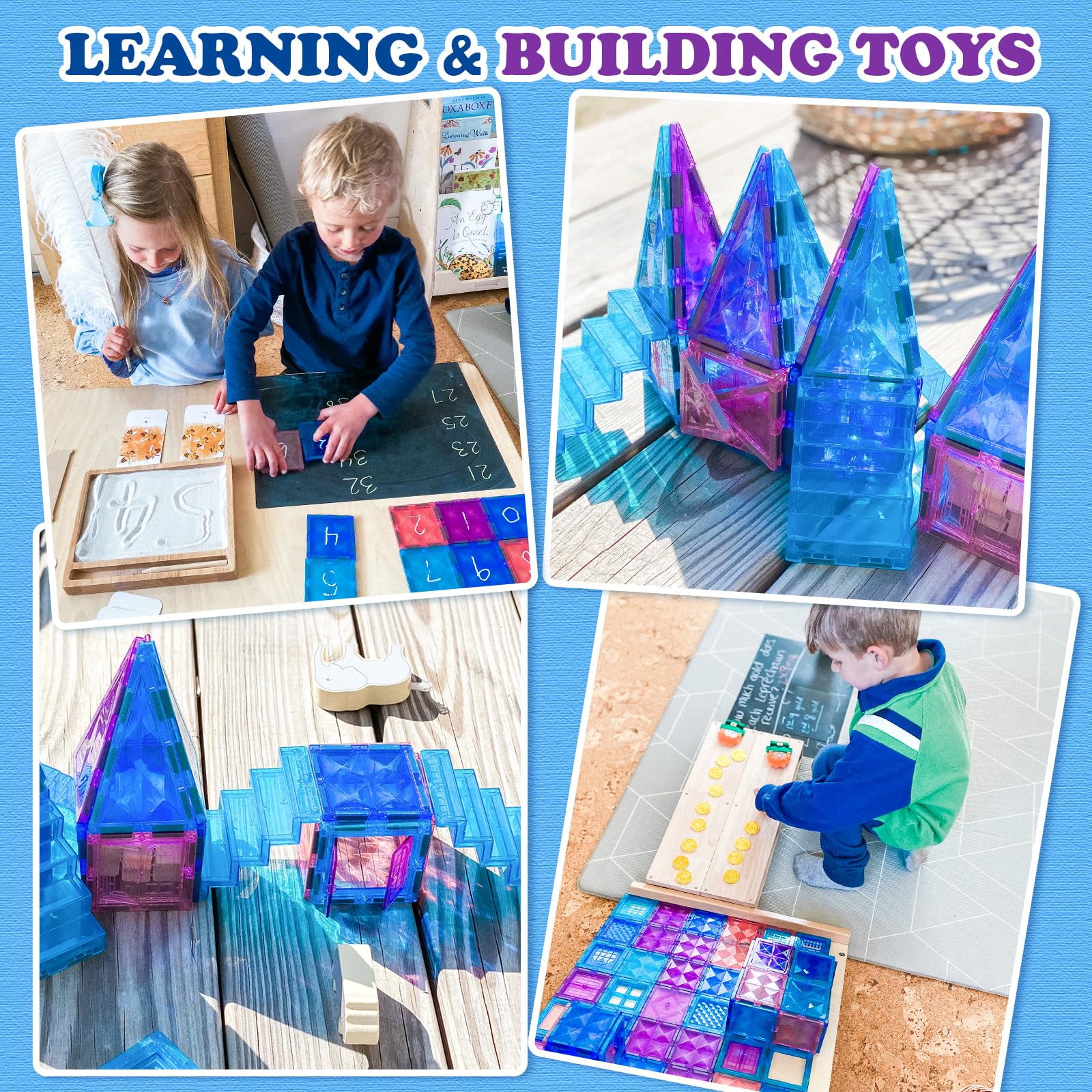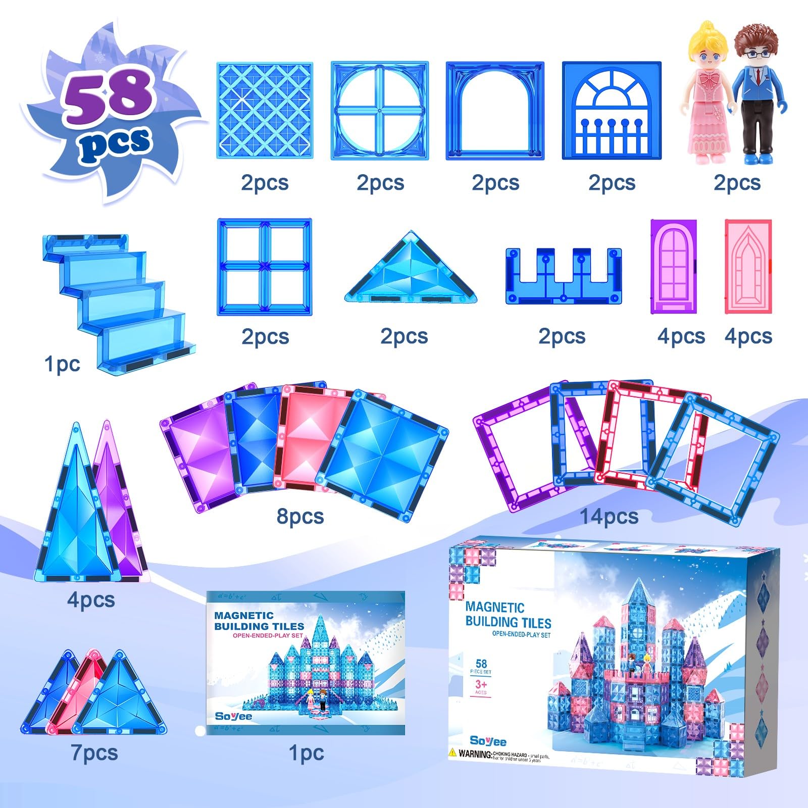 - VARIOUS SQUARES & DIAMOND MAGNETIC TILES - The 58pcs magnet toy is made of safe and durable Food-grade ABS plastic, complete with doors, windows, and stairs, our diamond magnetic tiles toddler toys set has carefully picked durable parts so your princess can build her own winter castle and kingdom
