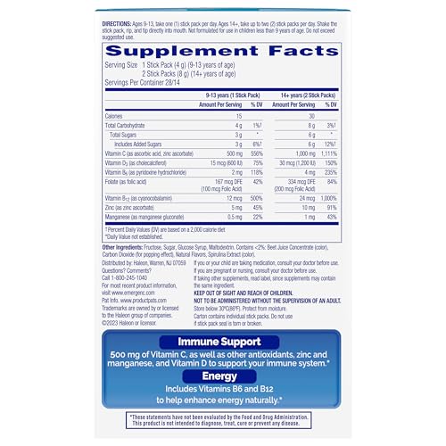 - Box of 28 stick packs of Emergen-C Immune+ Crystals, On-the-Go Immune Support Supplement, Berry Lemonade flavor