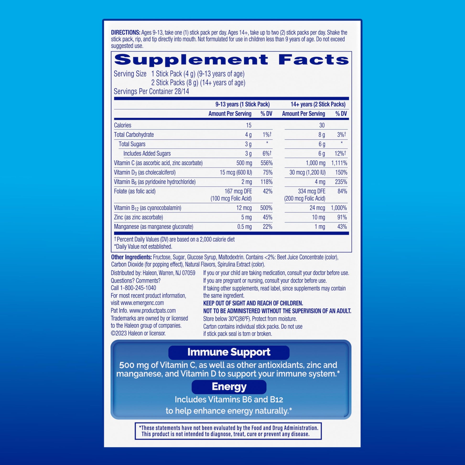 Details: Emergen-C Immune Plus Crystals are your on-the-go solution to fortified immune support!(1) Enhanced immune support formula with vitamin D for when you feel you need extra immune support.(1) Packed with essential nutrients and deliciously crafted in a Berry Lemonade flavor, these convenient stick packs bring you the ultimate immune supporting experience. Immune Support with 500mg of Vitamin C as well as other antioxidants, zinc, and manganese, and Vitamin D to support your immune system.(1) But that’s not all- we’ve infused vitamins B6 and B12 to help enhance energy naturally.(1) It's a comprehensive blend that caters to your immune and energy needs in one easy-to-carry pack. Forget the hassle of water – our crystals are designed for an instant rip-and-pour action directly into your mouth. No mixing, no fuss, just the refreshing burst of Berry Lemonade goodness. Designed to fit seamlessly into your pocket, bag, or car, Emergen-C Immune Plus Crystals are your compact companions for those busy days. (1) These statements have not been evaluated by the Food and Drug Administration. These products are not intended to diagnose, treat, cure, or prevent any disease.