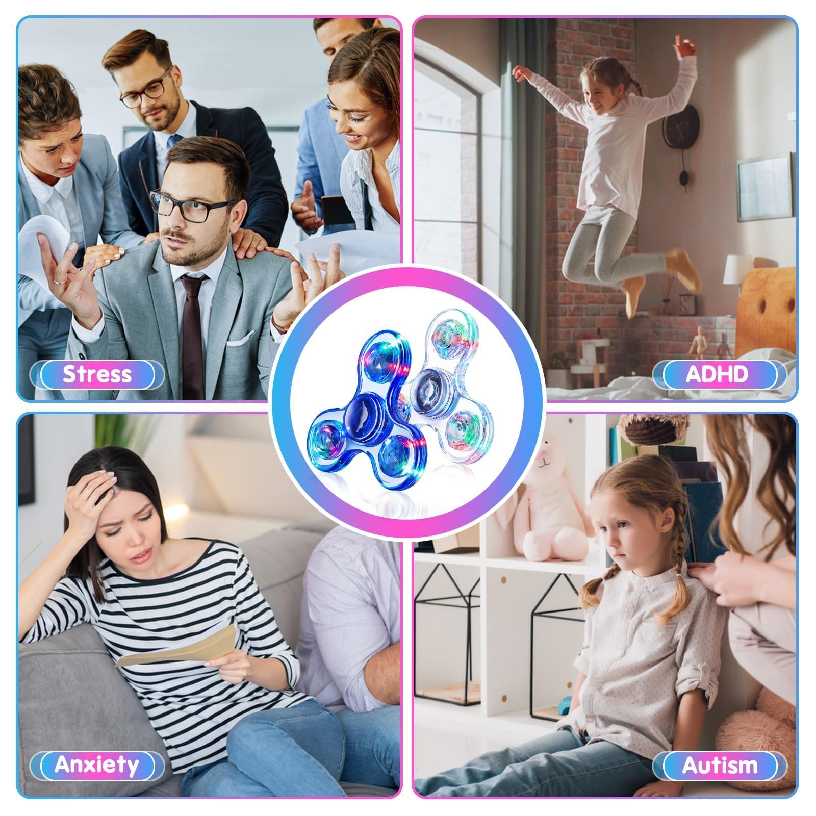 - Light Up Sensory Fidget Spinner: Pressing the switch button on the each leaf of the fidget spinners to light up the fidget toys. The fidget toys has three flashing modes, and the different modes turn to create amazing patterns. With an assortment of colors, these sensory fidget toys offer a soothing sensory tactile experience that can help improve concentration and promote relaxation
