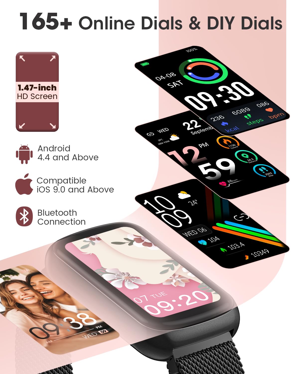 - [2 Watch Bands, 165+ Watch Faces] The sporty silicone band and the exquisite magnetic metal band can match any clothes in your wardrobe, whether it is business style or sporty style. 165+ watch faces are available for you to choose, and you can also customize your unique dial with your favorite photos. The combination of 14.5g ultra-light body and 1.47-inch high-definition screen brings the ultimate user experience to people who wear this fitness watch.