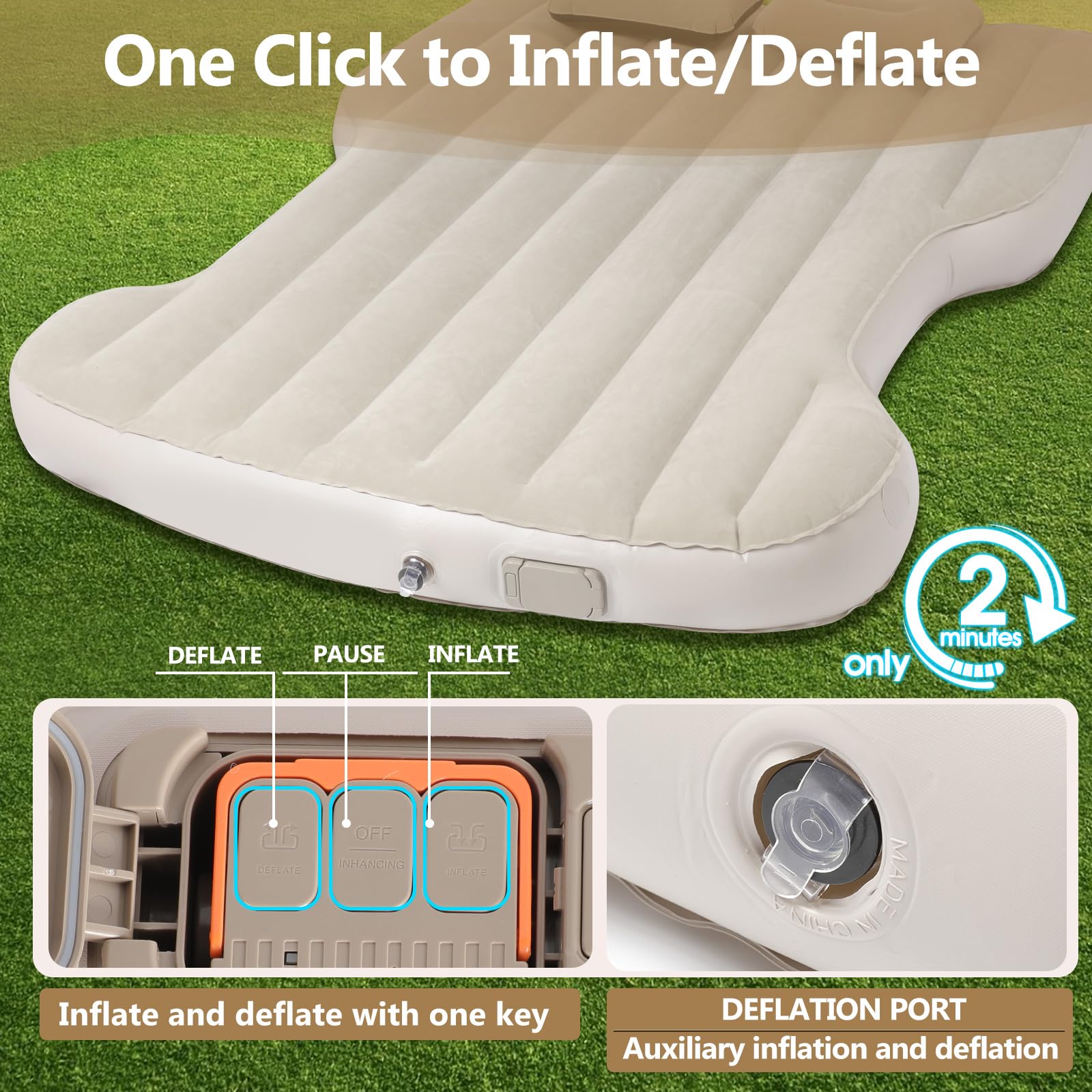 - 【One Click to Quick Inflate/Deflate】The Tesla Model Y bed mattress uses the latest built-in electric pump technology that can be controlled by a button to achieve automatic inflation and deflation within 2 minutes, and there will be no leakage for at least 48 hours. Movable air pump can be charged and illumination