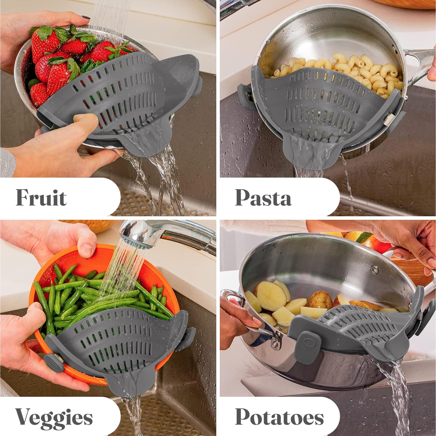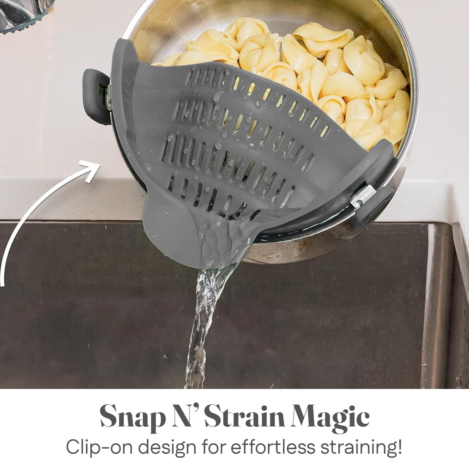 Kitchen Gizmo Snap N' Strain - Silicone Pasta Strainer Clip-On for Pots and Pans - Heat Resistant Colander for Vegetables and Noodles - Kitchen Gadgets for Cooking - Space-Saving Design - Grey