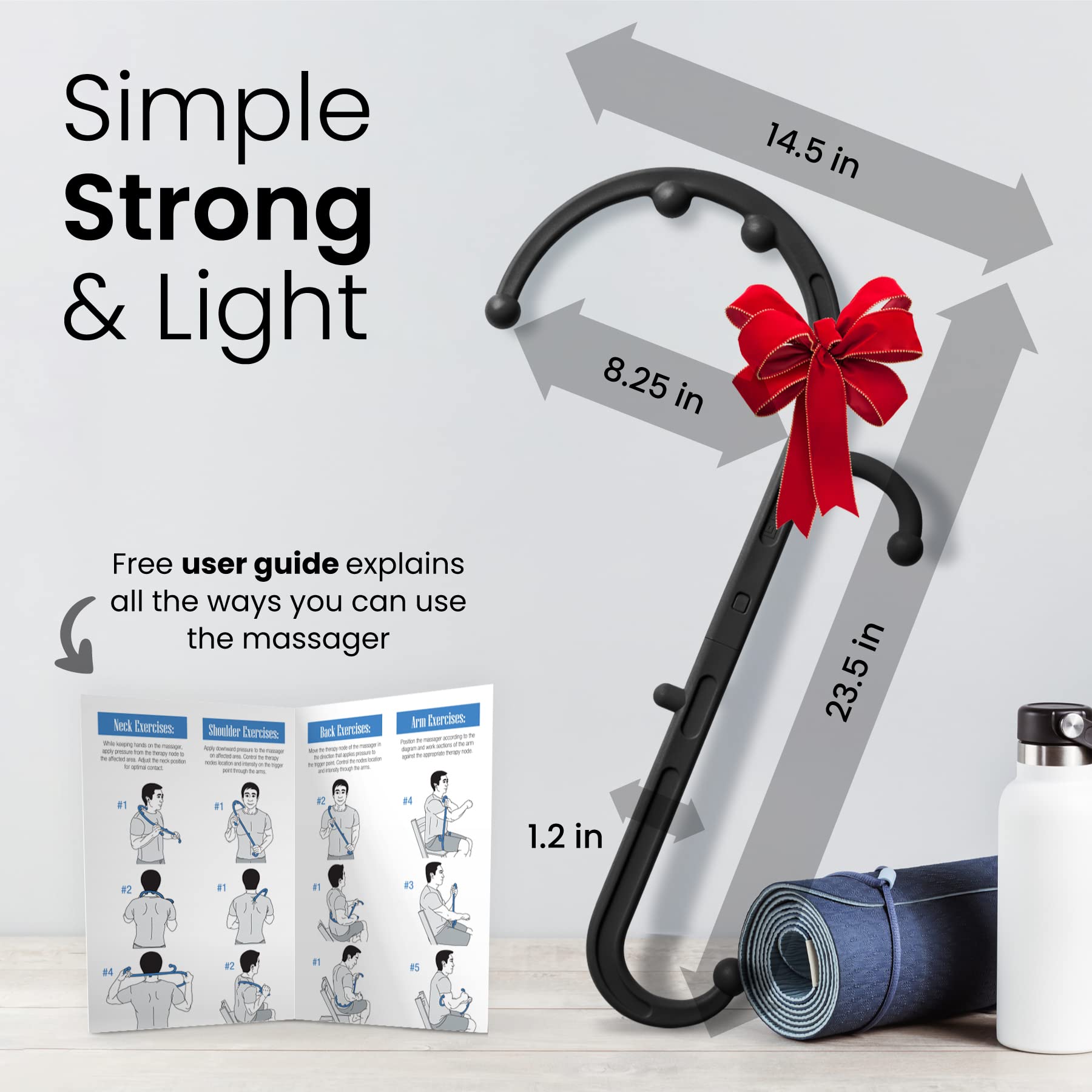 - Ideal Size Massage Tools -Less than a pound. Anything over a pound can easily fatigue the arms and hands diminishing the accuracy and pressure applied to the affected muscle group and impeding recovery and healing, When used consistently. Also, the awkward handle shape and positioning on many popular massagers can make it difficult to operate for those with limited range in mobility. Our massage stick design addresses those issues.