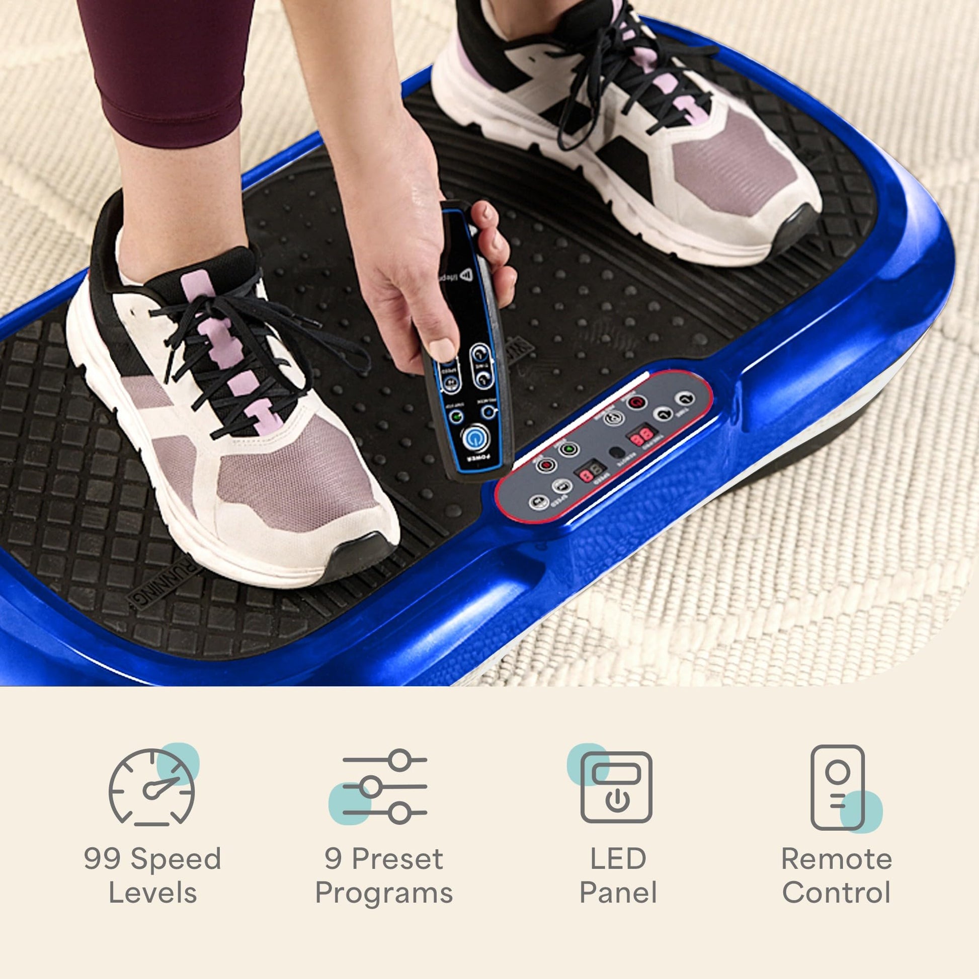 - Powerful and Customizable - Easily switch between 99 speed settings to maximize your workouts. The vibration board exercise machine features anti-slip rubber, a user-friendly display, and whisper-quiet vibrations for maximum convenience.