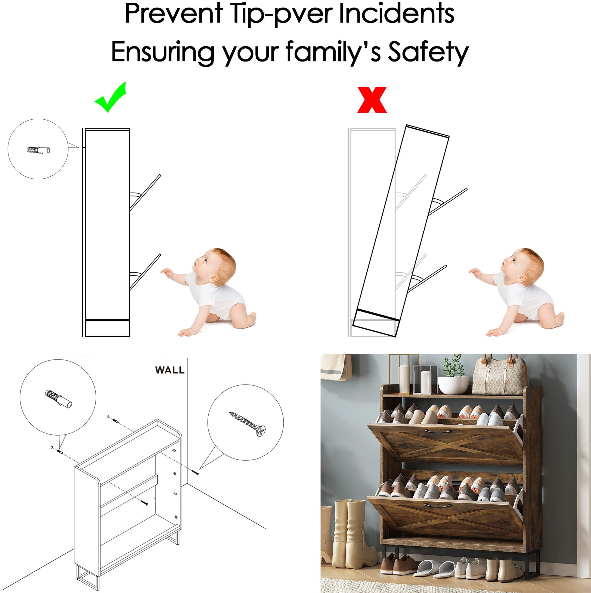 - Safe and Reliable Quality: This slim shoe cabinet contains an anti-tipping device, which can be fixed on the wall to prevent tipping and protect children's safety. Made of high-quality MDF wood and metal legs, the stable structure ensures super load-bearing capacity. The black metal handle is simple and elegant, feels comfortable, and prevents scratches and injuries during use. The black metal legs prevent the floor from being scratched, and can be easily cleaned with a damp cloth