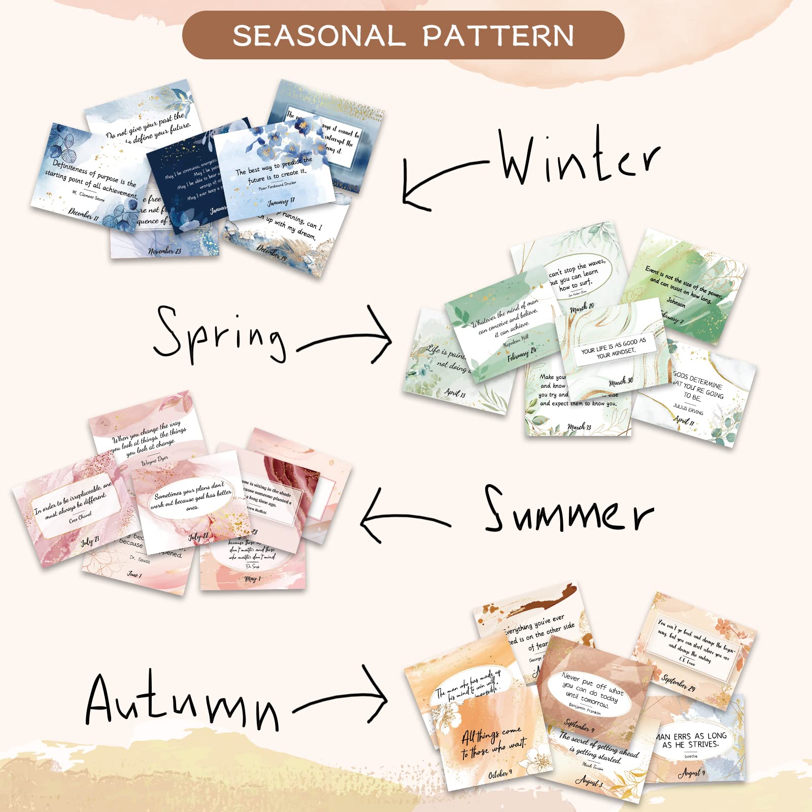 - FUNCTIONAL ORGANIZATION - Large sturdy twin-wire binding + Premium thick paper + Sturdy base + Beautiful hard cover + A beautiful present box + Six goal planning cards. Each day has a beautiful design with an inspirational saying. All of these make the motivatiaonal calendar a perfect choice for leading you a clear life.