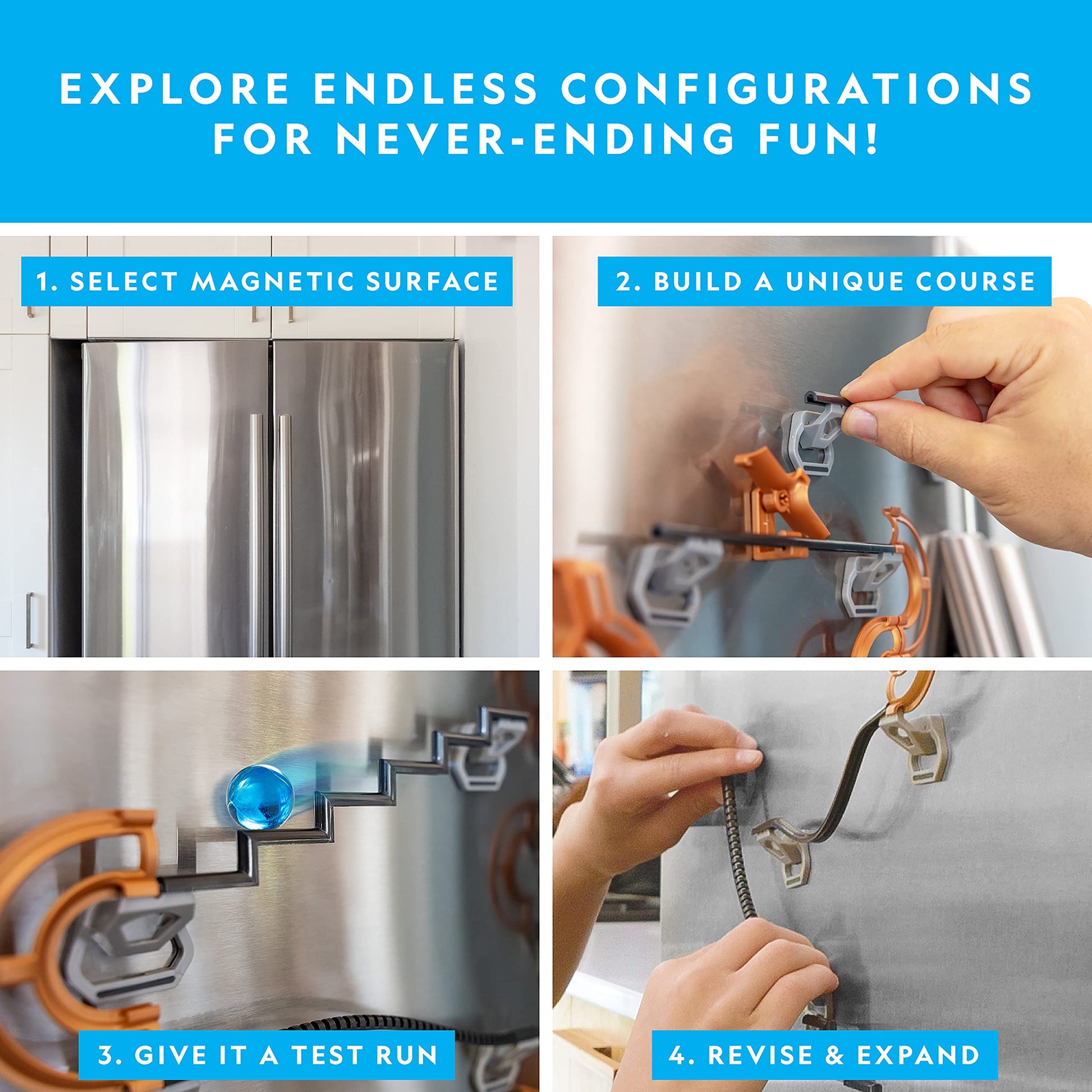 - BUILD ANYWHERE MAGNETS STICK - This STEM marble maze for kids and adults can be built on any vertical magnetic surface like the fridge, lockers, whiteboards, workbenches & more!