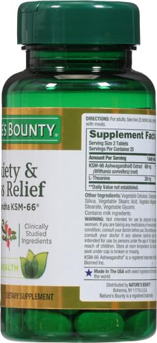 Details: From pressing deadlines to personal challenges, we all have our share of stressful moments. Nature's Bounty Stress Relief tablets promote a relaxed mood to help you feel calmer and ready for anything. (1) Our formula features the clinically studied herbal extract Ashwagandha KSM-66, which supports a healthy response to occasional stress. (1) For additional benefits, each serving of Nature's Bounty Stress Relief contains L-Theanine 200mg to support the mood centers of the brain and promote a tranquil state of mind. (1) Simply take two tablets daily, preferably with meals. Looking for supplements to help support stress without unnecessary additives? Nature's Bounty Stress Relief tablets are non-GMO, gluten free, sugar free, and contain no artificial color, flavor or sweetener. Each pack contains 50 tablets.