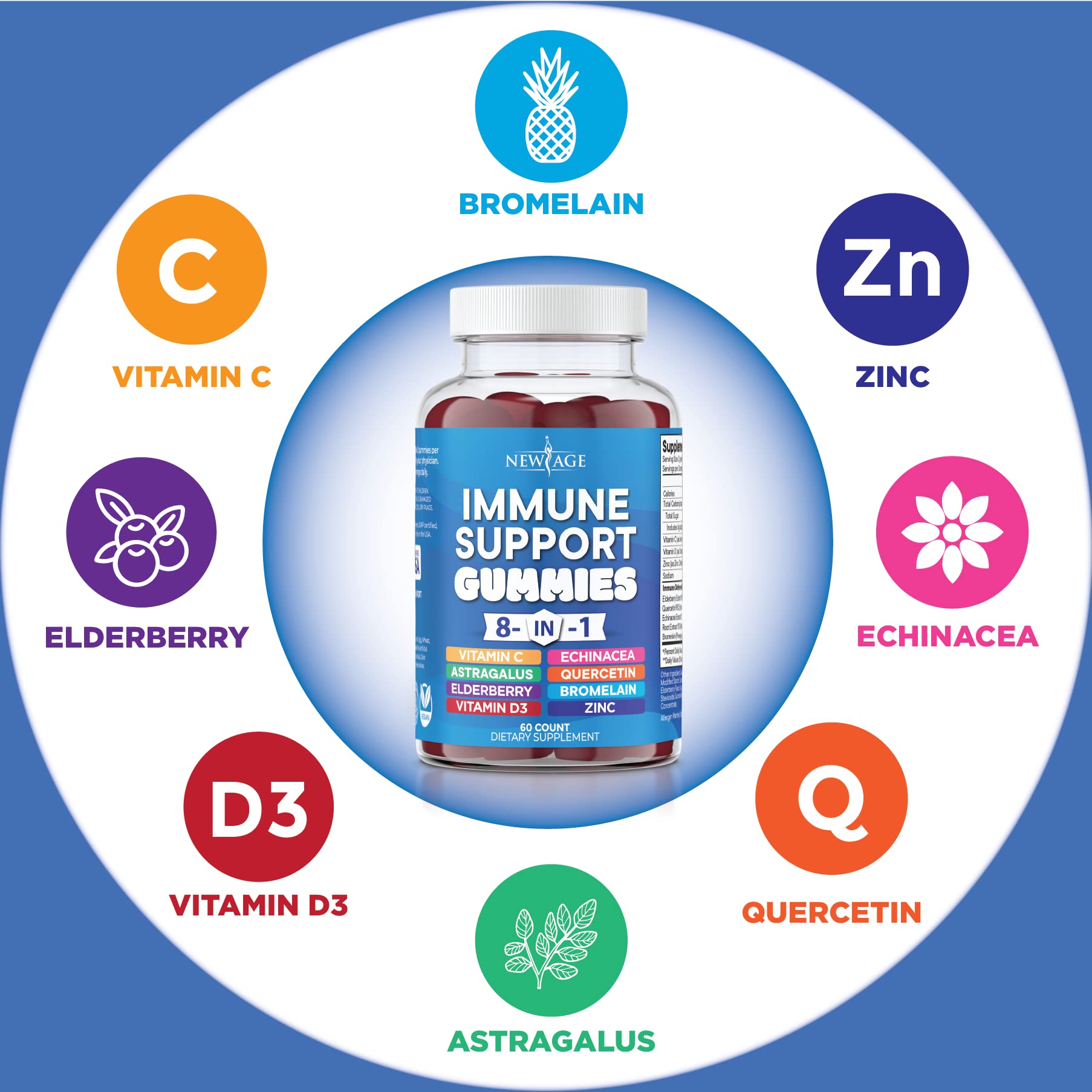 NEW AGE 8 in 1 Immune Support Booster Supplement with Astragalus Root, Vitamin C and Zinc 50mg, Vitamin D 5000 IU, Quercetin & Bromelain (8 in 1 Gummies (Pack of 2))
