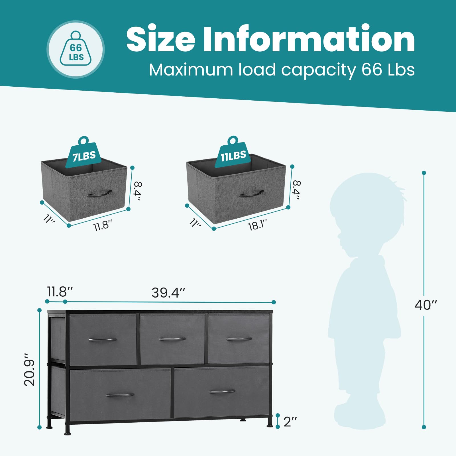 - 【Large Capacity】This grey dresser offers 5 drawers, providing sufficient space for daily necessities organizing. 2L and 3M drawers with plentiful space are designed to satisfy your various storage needs and will always keep your room in perfect order. The wooden top of bedroom dresser is great for keeping the most-used items within your reach. Drawer dimensions: L (11.8" L x 11.8"W x 8.5" H) ;M(12"L x 11.4"W x 8.3" H)