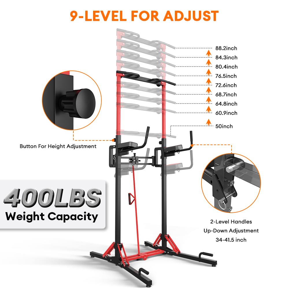 - 9 Levels of Height Adjustment: Power towers come with adjustable height bars, which can be easily customized depending on the user's height and the exercise they want to perform. There’re 9-level adjustable height, the height of the pull-up bar can be adjusted from 50" to 88.2". It is suitable for exercise use by the whole family.