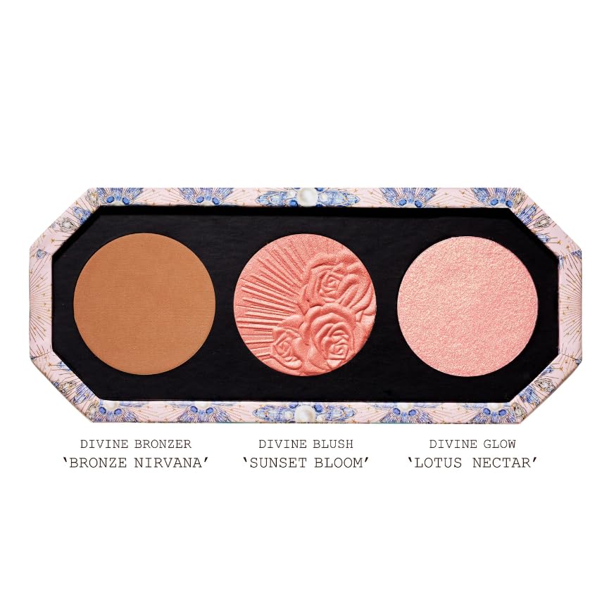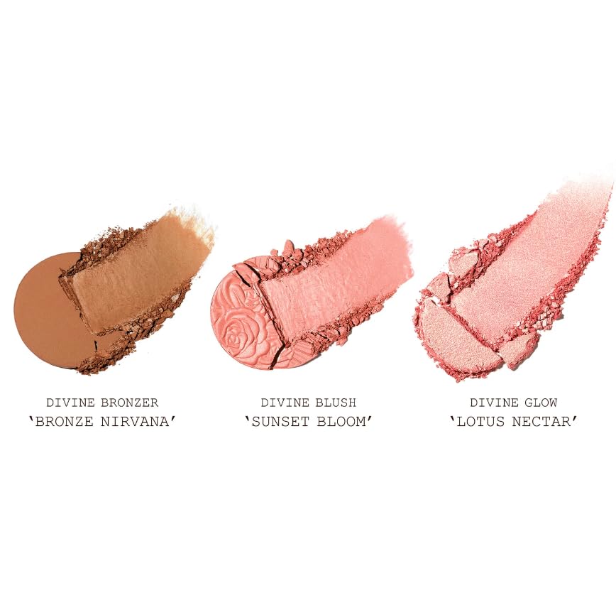 Details: HOW TO USE: Apply Divine Blush and Divine Bronzer shades individually or blend together for customisable, buildable color. Apply Divine Bronzer beneath cheekbones and onto the temples while softly blending for sublime structure. Sweep Divine Glow Highlighter across the high points of the face, collarbones and décolletage for luxurious luminosity. External use only. Avoid contact with eyes. In case of contact with eyes, rinse immediately. Please keep away from children. Please note that product is not hypoallergenic. Consult with doctor if you are not sure if this product is good for you. Follow instructions on how to use carefully.