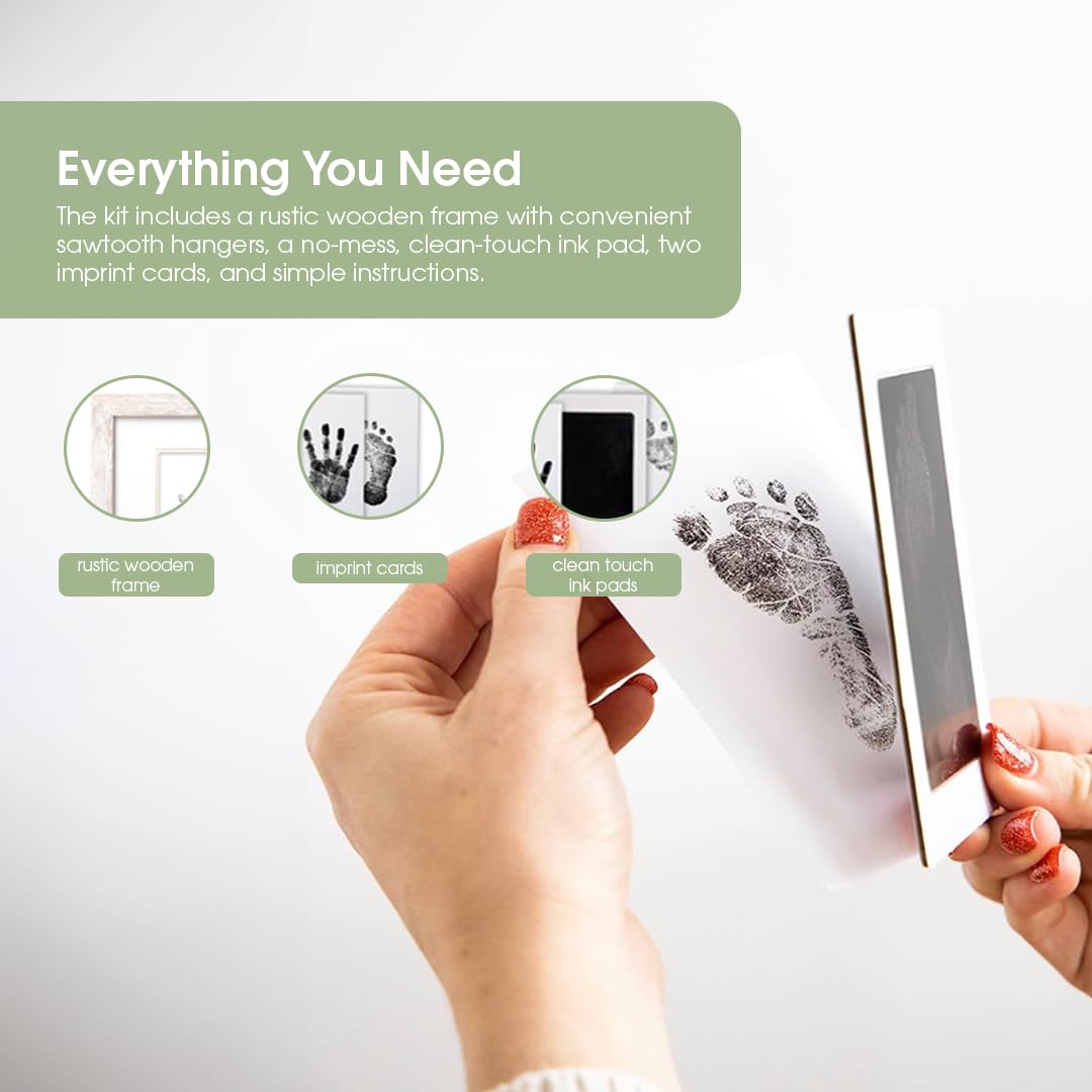 - Everything You Need: The kit includes a rustic wooden frame with convenient sawtooth hangers, a no-mess, clean touch ink pad, two imprint cards, and simple instructions. The non-toxic clean touch ink pad safely captures tiny prints up to 2.25” W x 3.5” H, perfect for newborns.