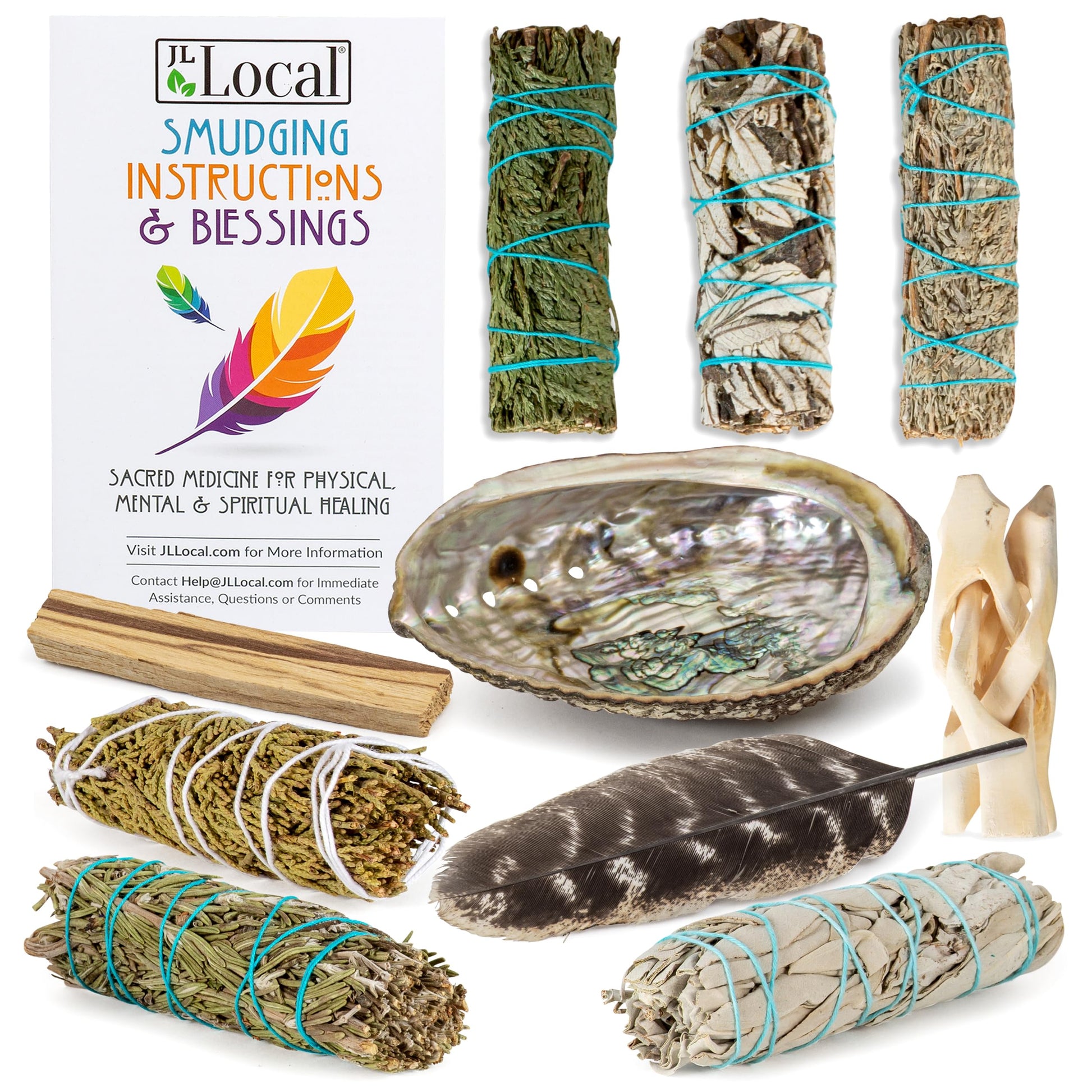 Sage Variety Smudge Kit - White Sage, Blue Sage, Cedar, Juniper, Yerba Santa, Palo Santo, Rosemary, Abalone Shell, Stand, Feather & Instructions | Smudging Kit, Sage Bundle, Smoke Cleanse