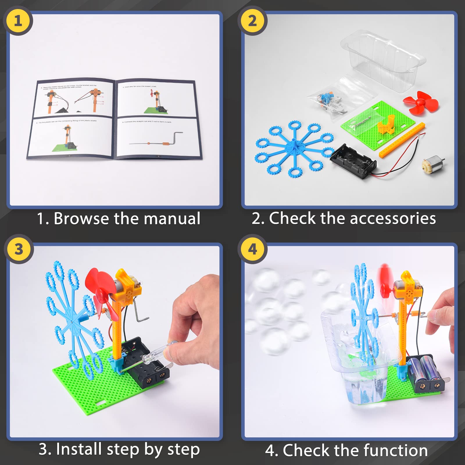 - 6 IN 1 STEM KITS: These science kits contain a reptile robot, a balance car, a bubble machine, a fiber lamp and a buzzer wire game kit. Kids will be proud of building their own robot. REQUIRES (NOT INCLUDED): BUBBLE SOLUTION, AA BATTERIES