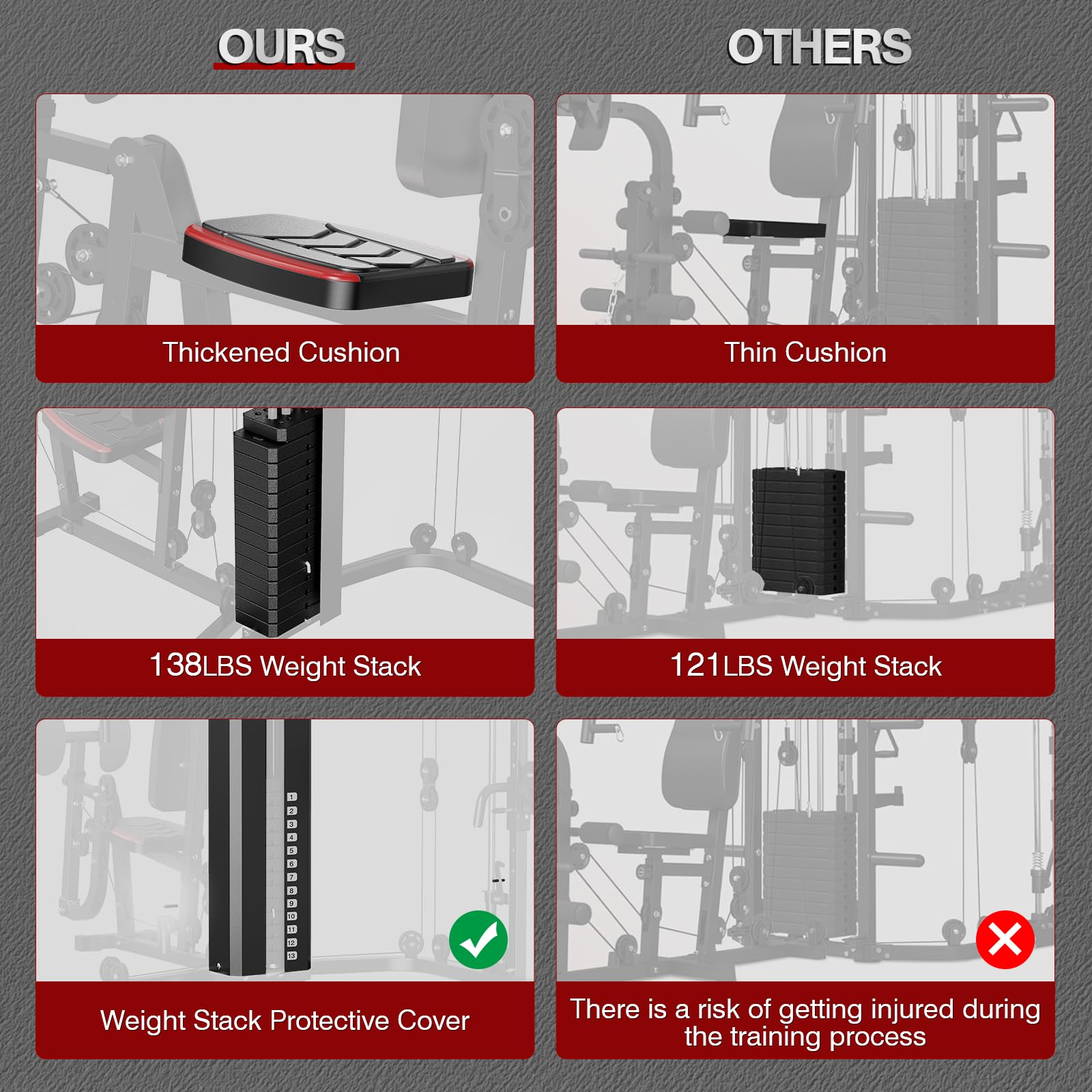 - ADJUSTABLE 138LBS WEIGHT STACK --- SunHome Home Gym System comes with a 138-pound selectorized weight stack that can be easily adjusted. Just find the right weight for you, and begin your training!( weights plates are not included. )