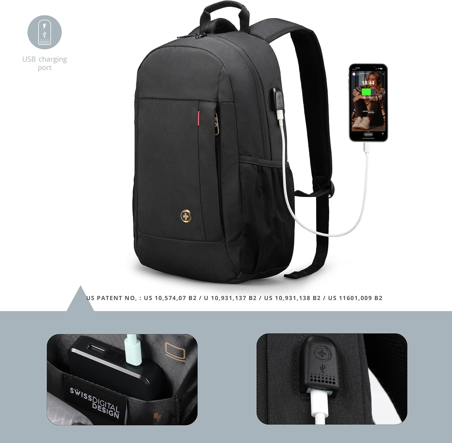 Swissdigital Design Travel Laptop Backpack, Business Anti Theft Slim Sturdy Laptops Backpack with USB Charging Port, College Tech Backpacks SD1634