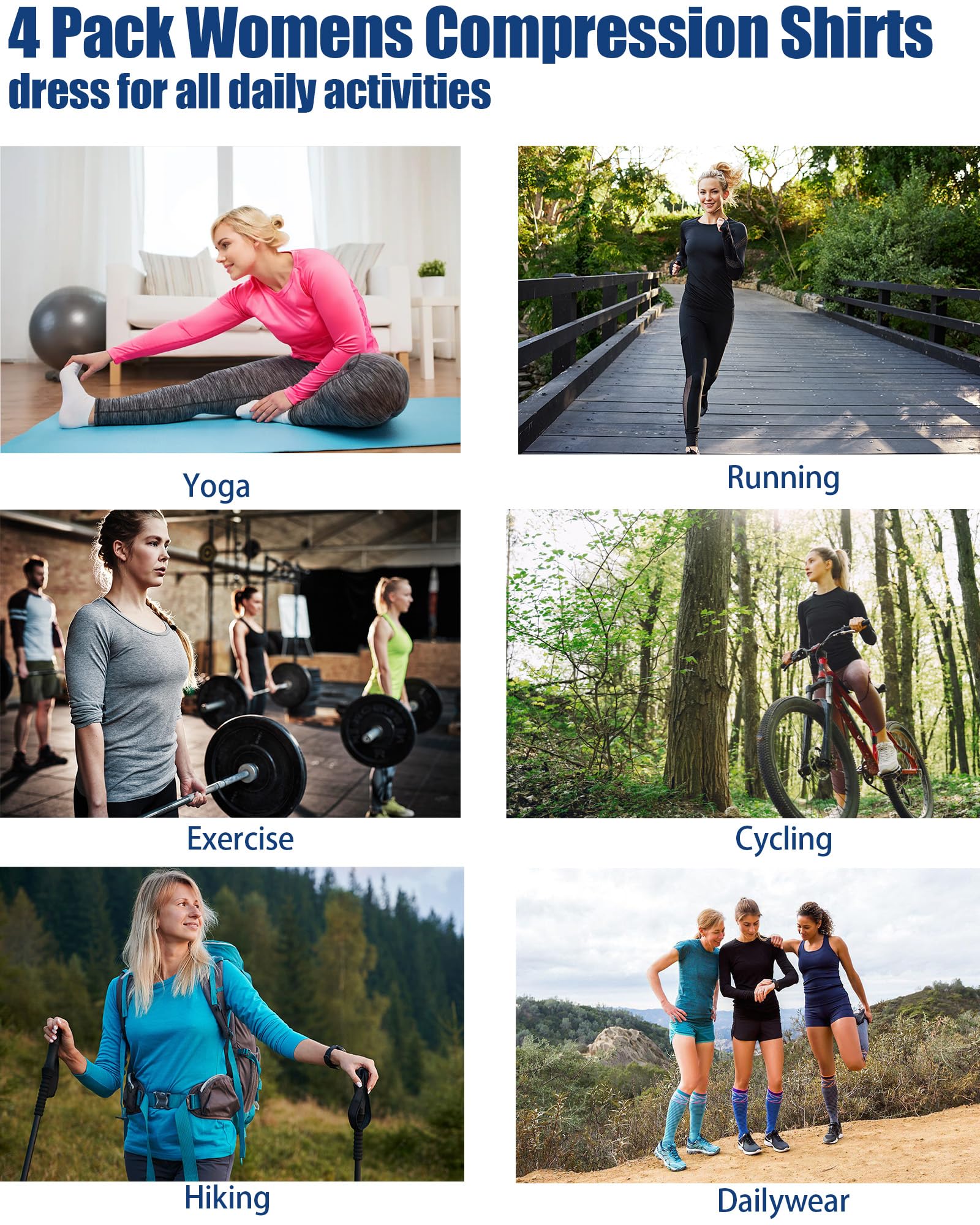TELALEO 4 Pack Women's Compression Shirt Long Sleeve Performance Workout Baselayer Athletic Top Sports Gear-Black/Black/White/White Large
