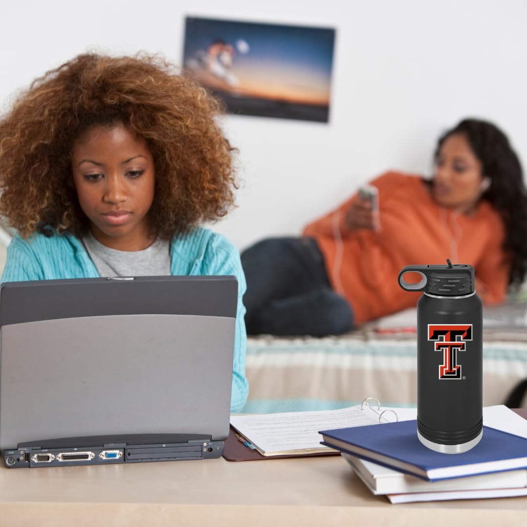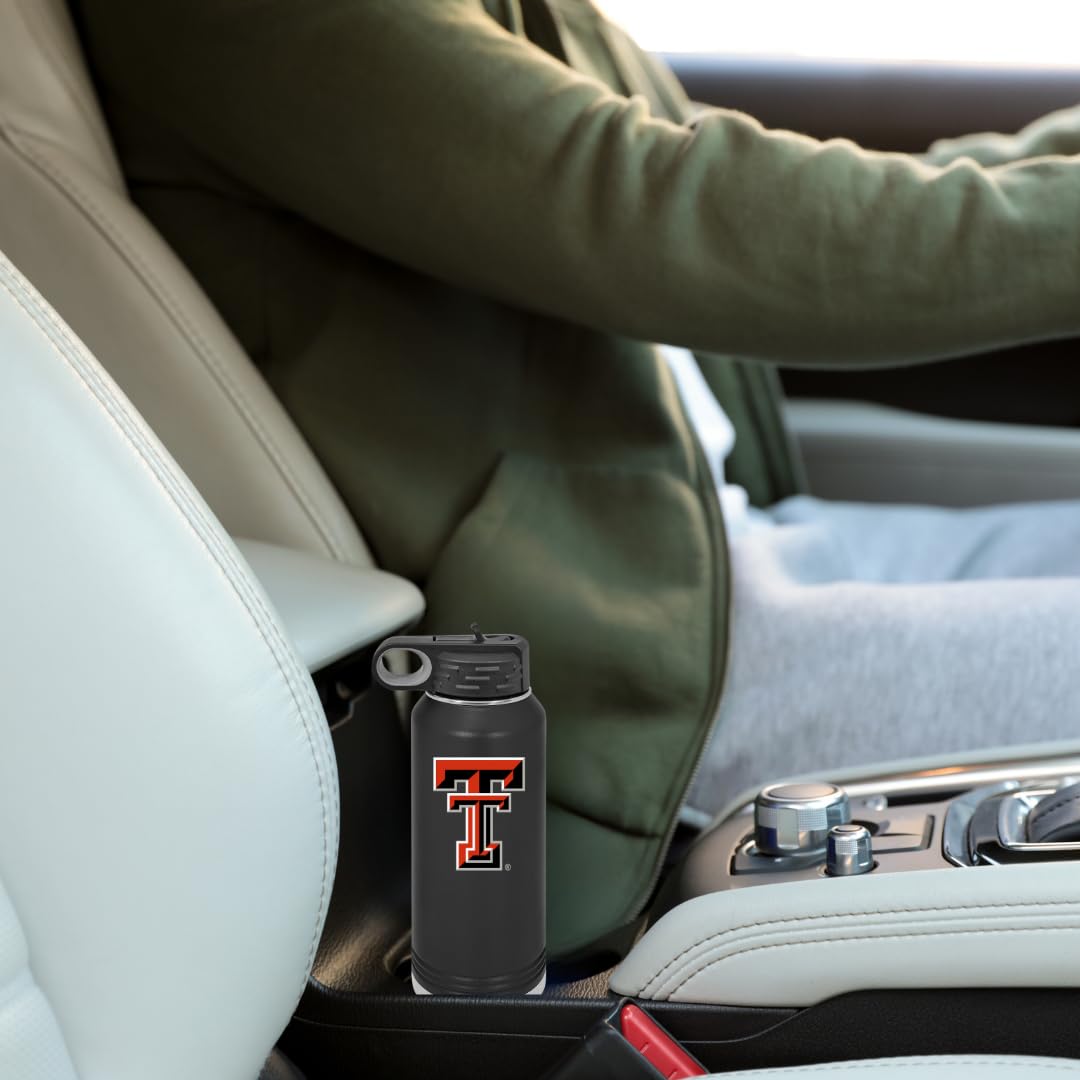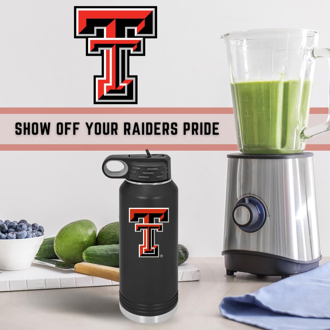 Texas Tech 32oz Stainless Steel Double Walled Black Beverage Bottle with Flip Straw Spout - College Gear for Playoff Season – For Office, Home or Auto – Show your Red Raider Prider