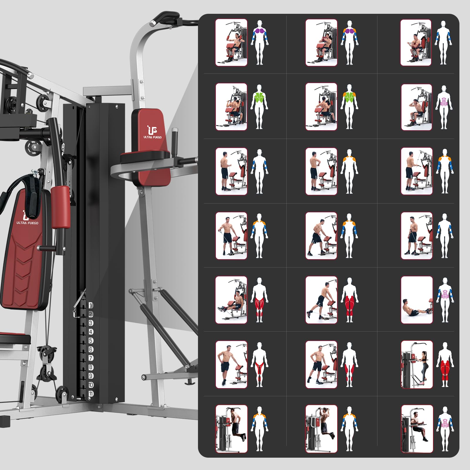 - DOUBLE PULLEY SYSTEM + POWER TOWER WITH STEPPER: Equipped with 118lb weight plates and a double pulley system, ULTRA FUEGO multifunctional home gym helps you carry out workouts targeting multiple muscle groups of your body. As a dual workout system, the home gym is designed with a power tower and foldable stepper on the side. Therefore, you can do workouts with your family members at the same time.