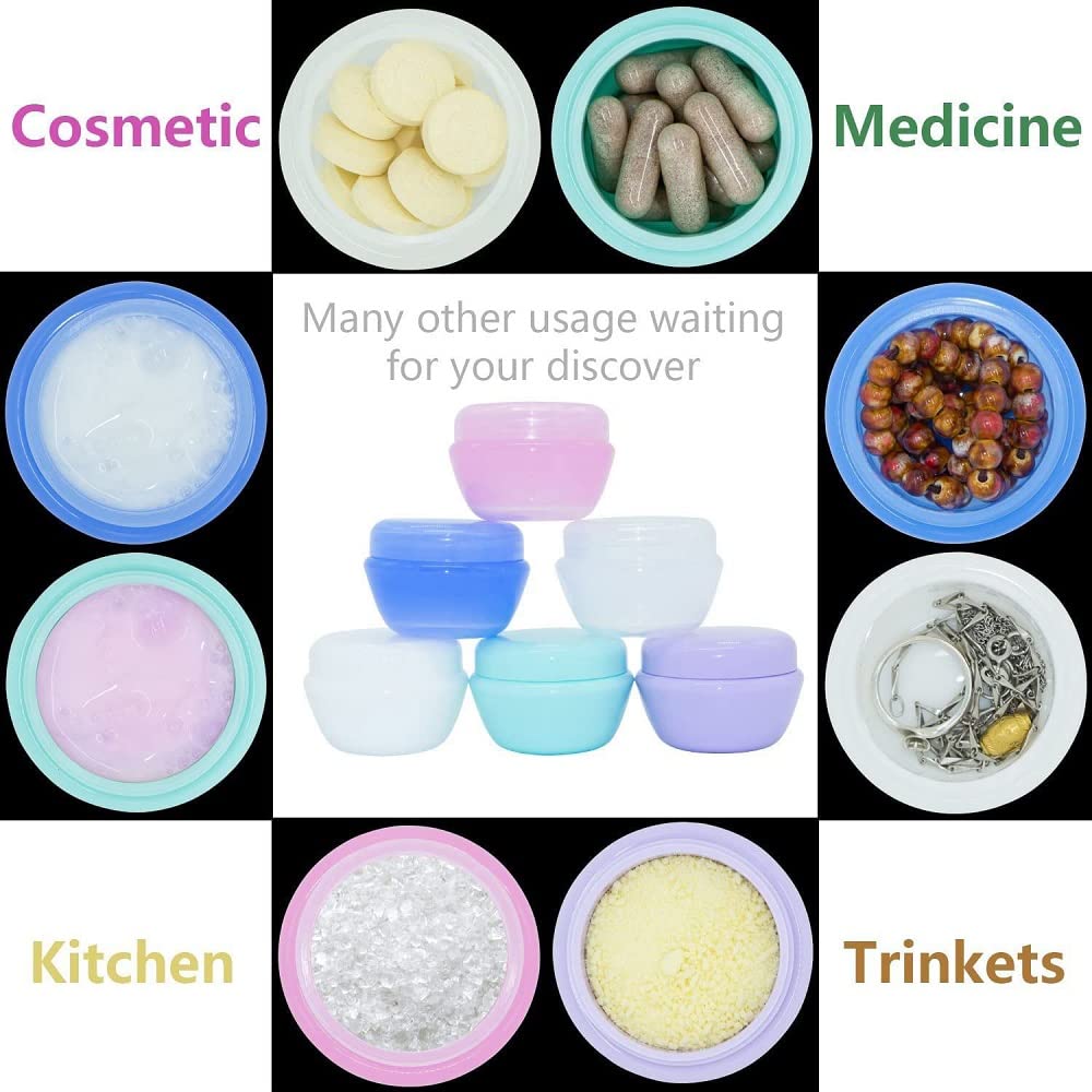 - 【WIDE USAGE】: These small travel jars are suitable for travel sized creams, gels, pastes, powders, lotions, makeups, lip balm, lip gloss, scrubs, salves, nail accessories, charms, beads. They also can store medicine, pills, small jewelry and more.