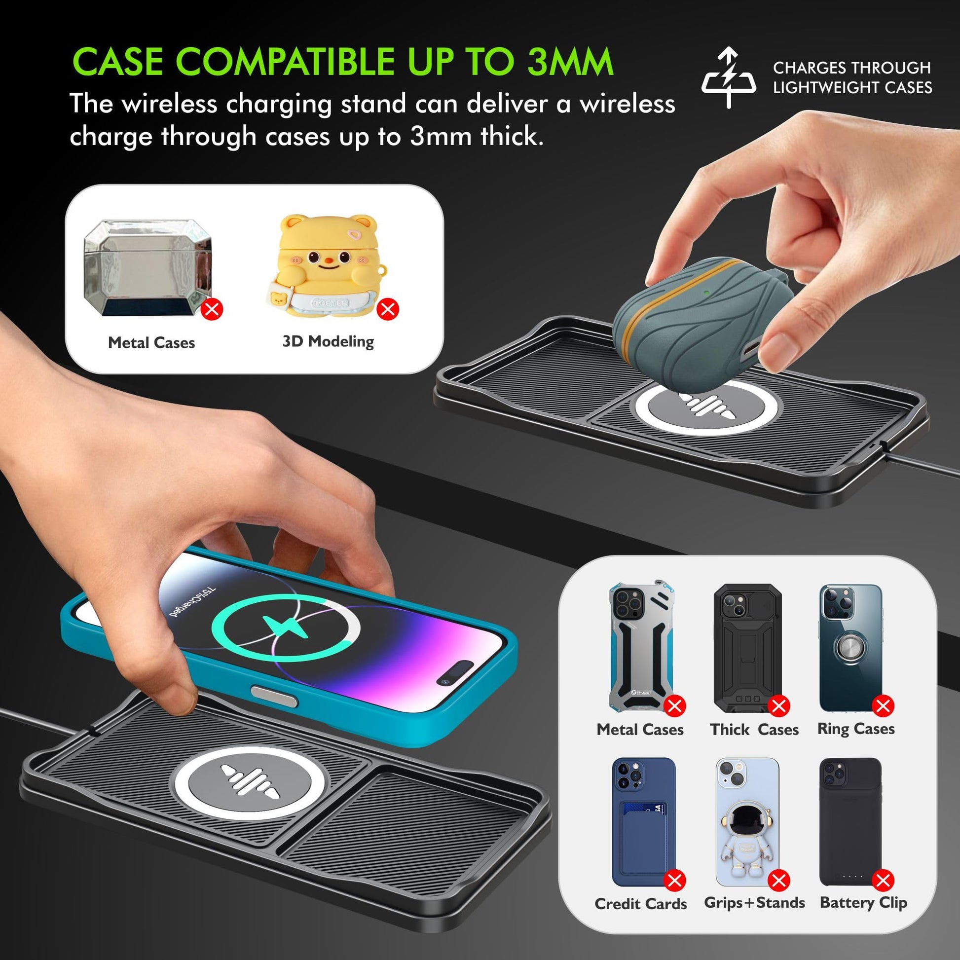 - Case-Friendly Design | Broad Device Compatibility: Charge seamlessly without removing your non-metal phone case. The car wireless charger pad is compatible with all Qi-enabled devices, including popular models like iPhone wireless car chargers and Samsung Galaxy smartphones, ensuring convenience and ease of use.