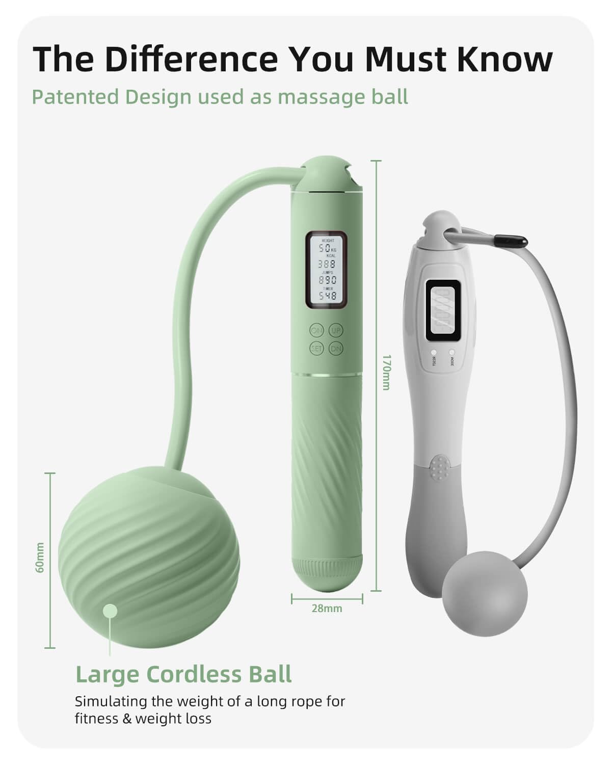 - 2.Patented 2In 1 Design for Stability: Our innovative design includes a large cordless ball that ensures the rope won't easily fall. The external thread of the ball doubles as a massage ball, simulating the weight of a long rope for fitness and weight loss. Additionally, two removable counterweights enhance fat burning and accelerate sweating.