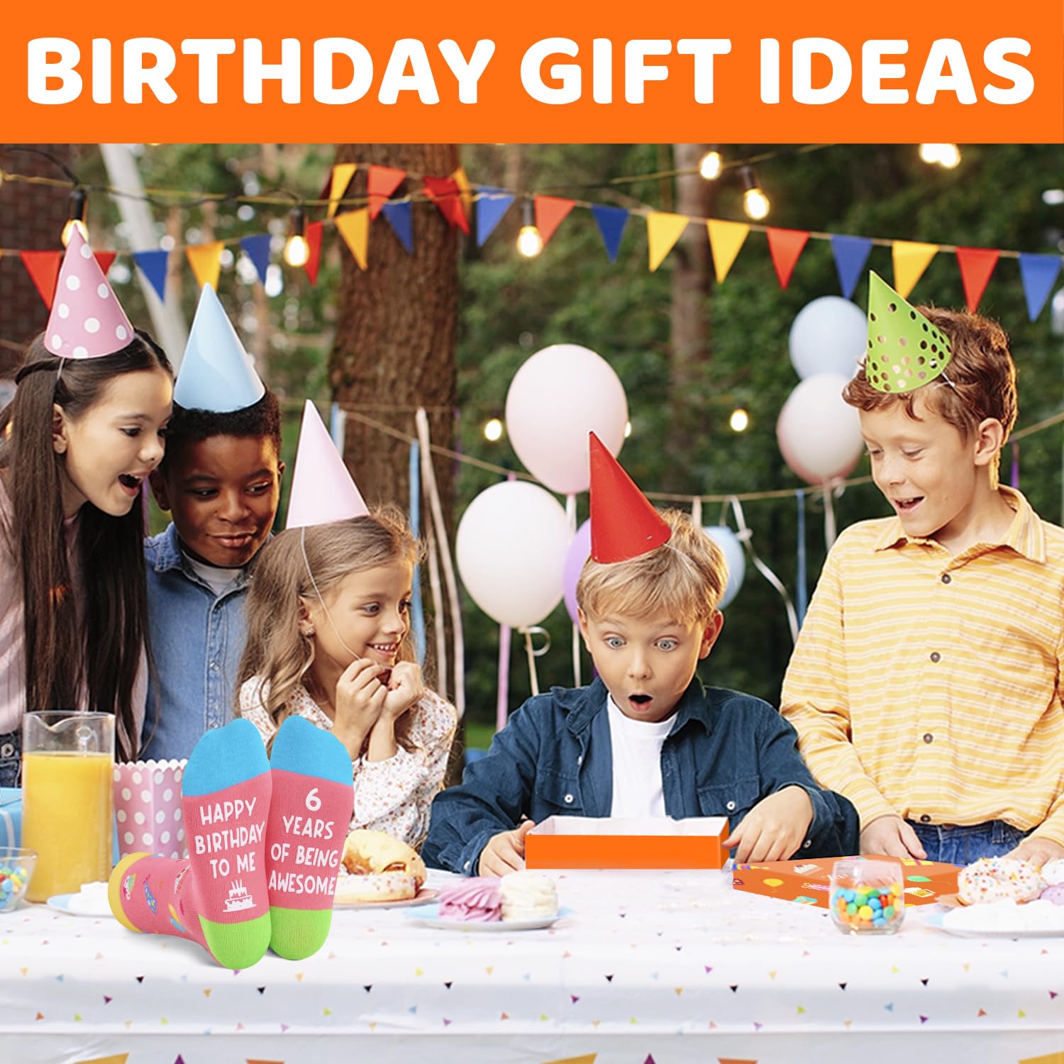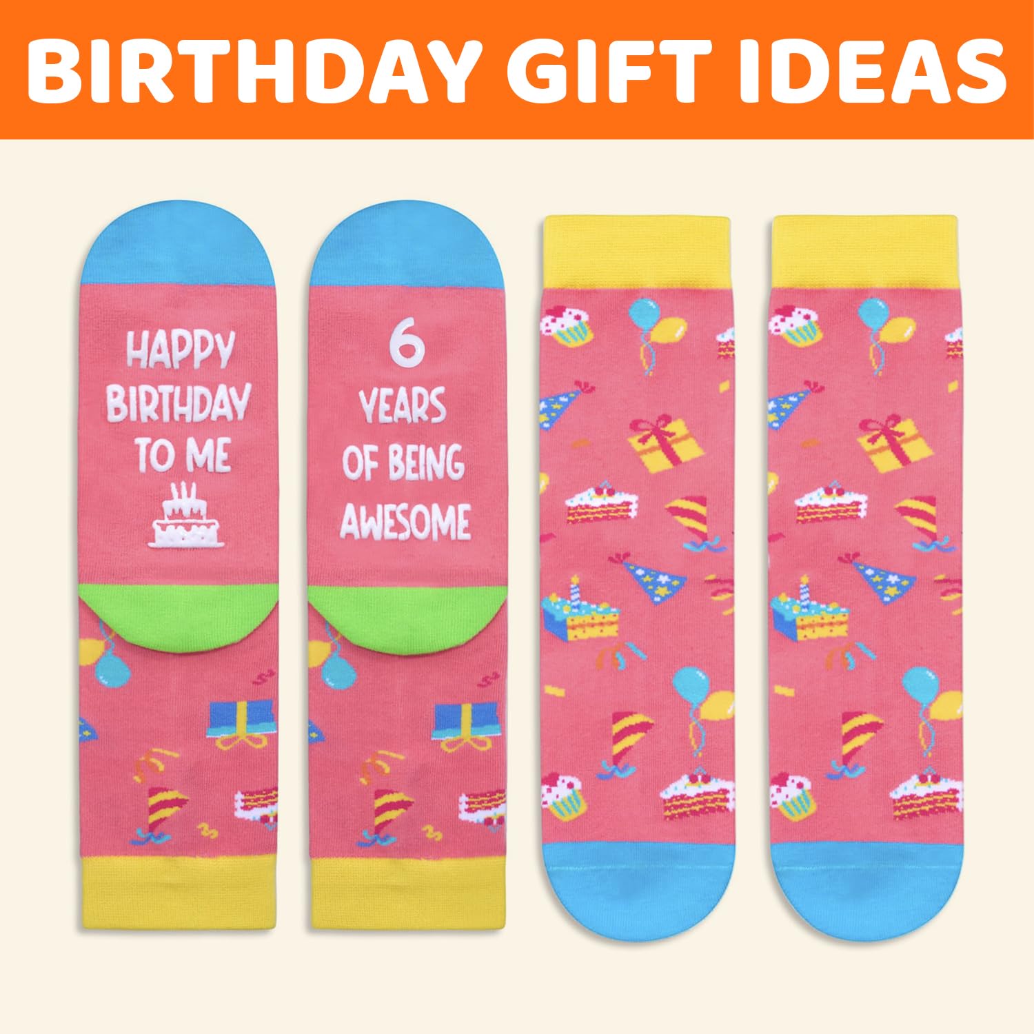 - GIFTS FOR CHILDREN: These socks feature birthday gifts, hats, balloons, cakes and other elements on the top, while the bottom features a hilarious secret message written in non-slip ink: "HAPPY BIRTHDAY TO ME, 6 YEARS OF BEING AWESOME." They are suitable for any holiday gifts, such as Birthday gifts, Christmas gifts, or White Elephant gifts.